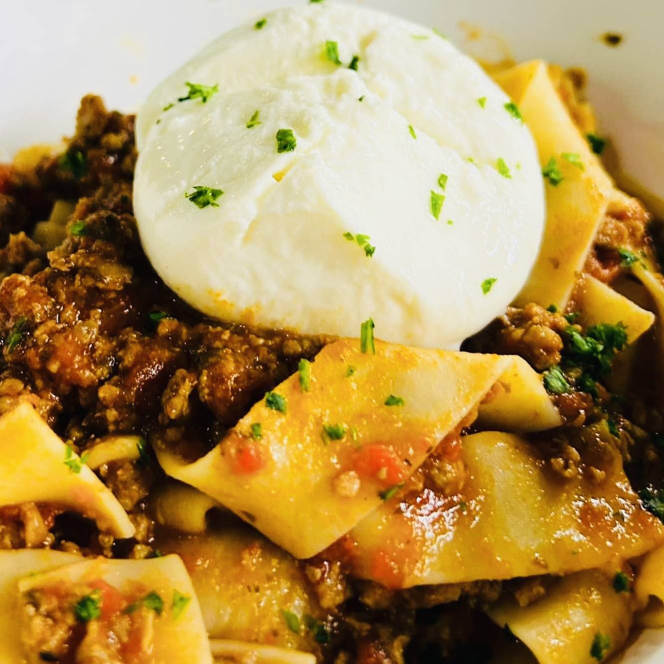 Homemade beef ragu served with whipped homemade ricotta cheese.