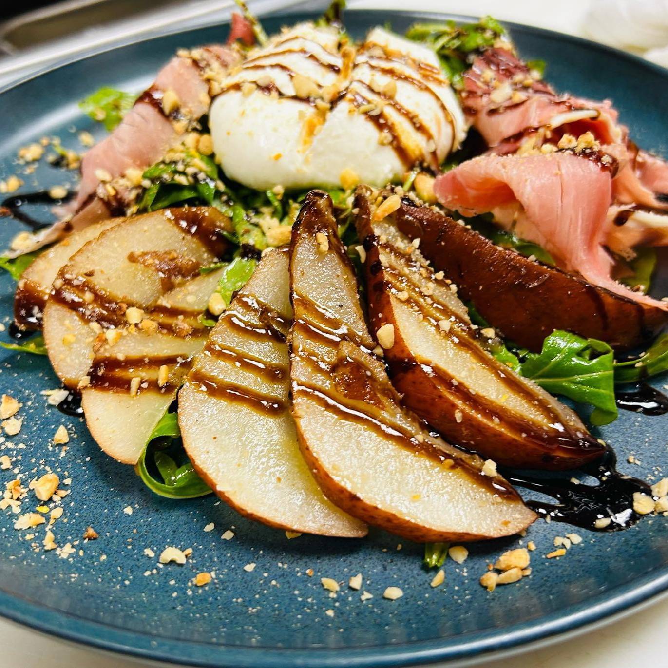 Arugula, baked pears, burrata, Prosciutto di Parma, toasted pine nuts, house-made lemon balsamic vinaigrette and a fig glaze.